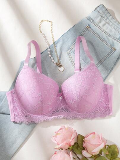 1 件性感蕾丝优雅舒适聚拢可调节钢圈防下垂聚拢加大码女士内衣文胸,提升 - 粉色 - 查看 1