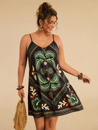 Travachic 大码女式夏季热带植物印花口袋休闲度假吊带连衣裙,黑色 - 黑色 - 查看 1
