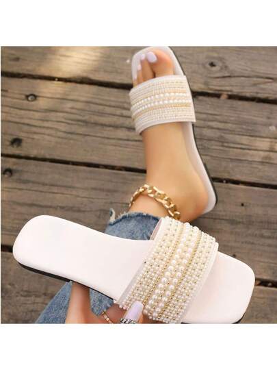 女式穿脱方便凉鞋,带水钻装饰,休闲百搭塑料平底凉鞋,夏季 - 白色 - 查看 1