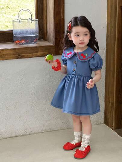 SHEIN Vintaside Kids 女童夏季轻便牛仔连衣裙,带有可爱的樱桃刺绣,甜美的荷叶边领子,适合休闲外出、野餐和日常穿着 - 藍色 - 查看 1