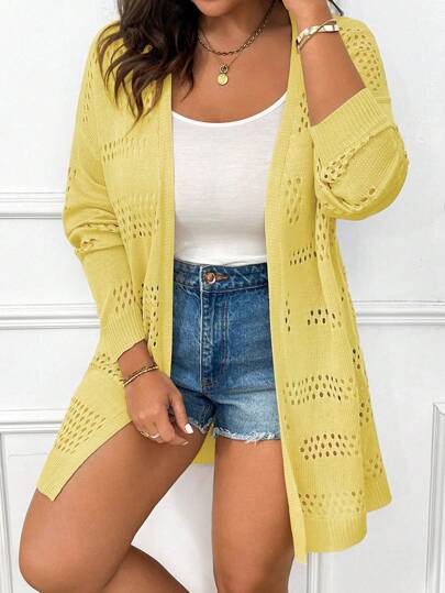 Elenzga 大码夏季假日镂空针织开衫,前开襟,落肩 - 黃色 - 查看 1