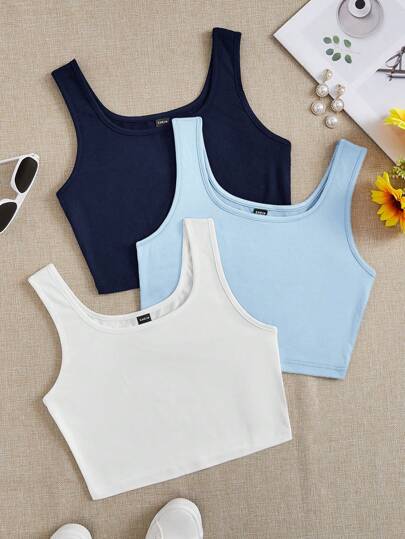 SHEIN EZwear 3 件套女式短款无袖背心套装,海军蓝、浅蓝、白色,休闲款,适合夏季 - 彩色 - 查看 1
