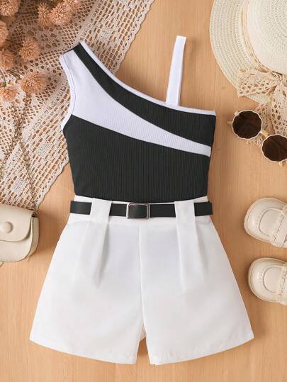 少女两件套休闲通勤套装,撞色不对称吊带背心和短裤,配腰带,适合夏季日常穿着 - 黑色 - 查看 1