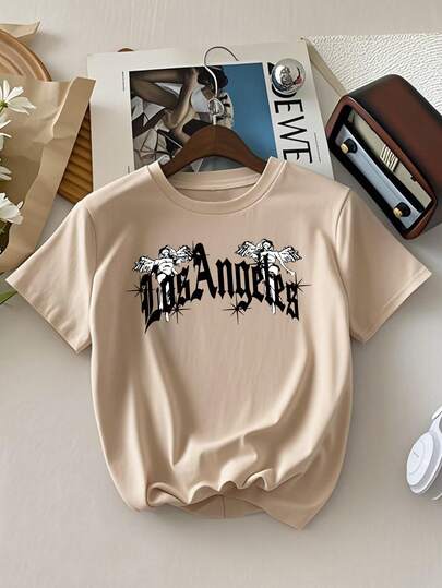 男童青少年学生休闲印花圆领短袖T恤,杏色,夏季上衣 - 杏色 - 查看 2
