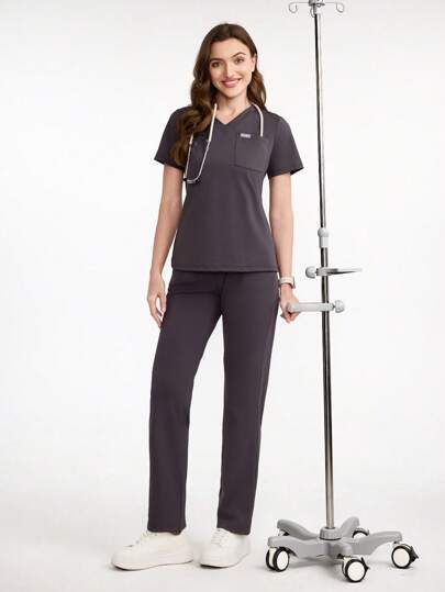 Scrubzie 纯色 V 领带口袋手术服上衣和裤子、手术服套装 - 深灰色 - 查看 5