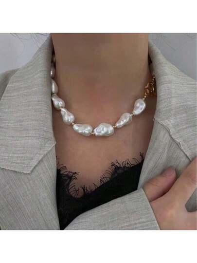 1 件复古风格金色串珠巴洛克珍珠不锈钢龙虾扣项链 - 白色 - 查看 1
