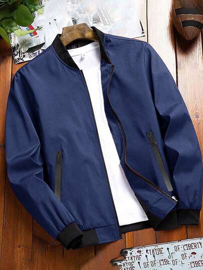 男士舒适翻领夹克 - 柔软纯色,拉链开合,长袖,商务风格,适合户外活动和休闲穿着,百搭透气 - 藍色 - 查看 1