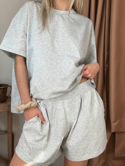 INAWLY Solva 2件套女士纯色落肩T恤和短裤休闲装 - 淺灰色 - 查看 2