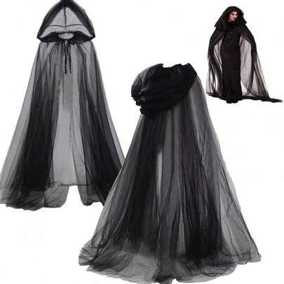 女款幽灵角色扮演连帽斗篷,巫师网纱长斗篷,适合派对表演 - 黑色 - 查看 1