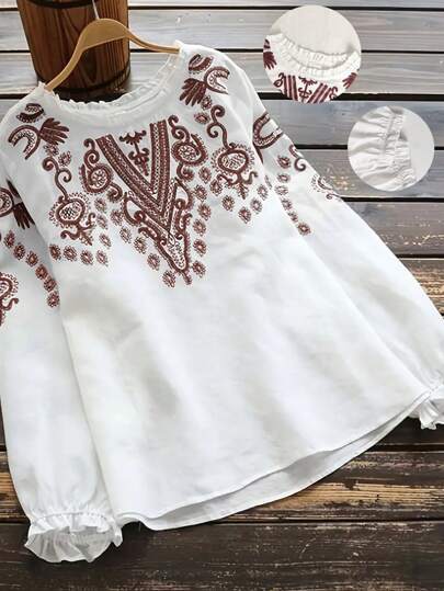 大码图案休闲纽扣衬衫,波西米亚度假上衣 - 棕色 - 查看 4