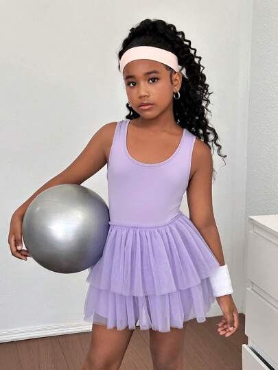 SHEIN Leap Crew 青少年女孩网眼拼布无袖连体衣运动服 - 紫色 - 查看 1