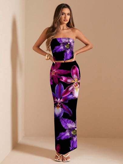 SHEIN BAE 2件套女士花卉印花抹胸和迷你裙优雅套装 - 黑色 - 查看 1