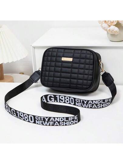 新款时尚纯色格子刺绣相机包,百搭字母肩带搭配金属装饰斜挎包,简约风格,适合户外旅行,高品质单肩包 - 黑色 - 查看 1