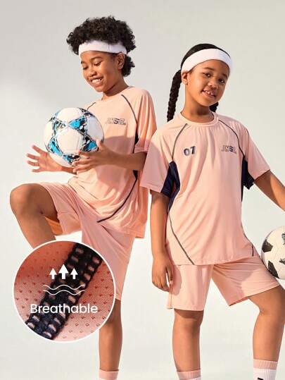 JNSQ 返校服,青少年男童户外运动短袖短裤制服T恤套装儿童圆领拼接撞色趣味字母印花户外运动短袖运动衫套装 - 橘色 - 查看 1