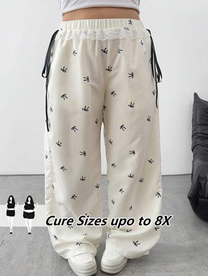 SHEIN CURVE+ 大码女式蝴蝶结印花拼布荷叶边下摆休闲裤,可爱设计 - 米色 - 查看 1
