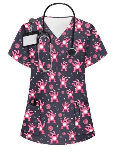 女式V领卡通印花短袖口袋磨砂上衣 - 彩色 - 查看 1