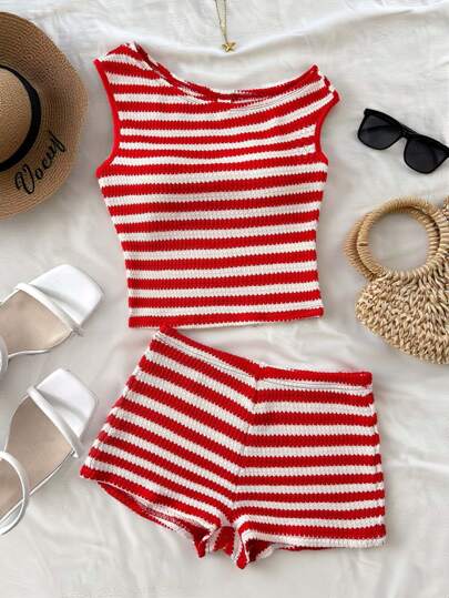 SHEIN 少女 2 件套条纹提花针织不对称肩部修身上衣和超低腰紧身短裤,适合节日、派对、圣诞节、情人节、约会、海滩、游轮、狂欢节、复活节 - 紅色 - 查看 1