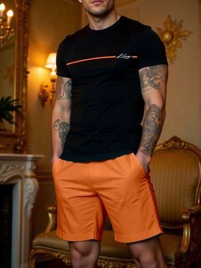 Manfinity Homme 夏季男士休闲字母印花T恤和短裤两件套 - 彩色 - 查看 1