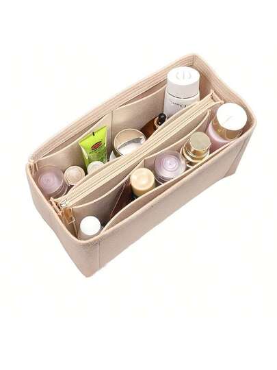 [别致的毛毡收纳袋] 多隔层别致的毛毡手提包收纳袋 | 宽敞的奶油色无纺布收纳袋,底部塑形,可存放化妆品、化妆刷和旅行必需品(奶油色/红色/黑色) - 米色 - 查看 1