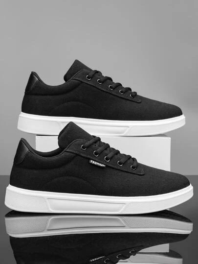 (小 1 码)男士帆布鞋,简约设计纯色平底鞋 - 黑與白 - 查看 1
