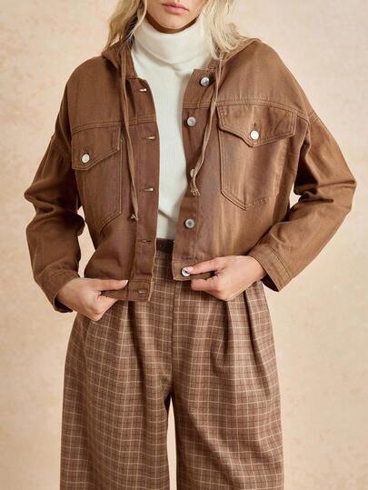 Écloséra 翻蓋口袋落肩袖抽繩連帽牛仔夾克 - 棕色 - 查看 1