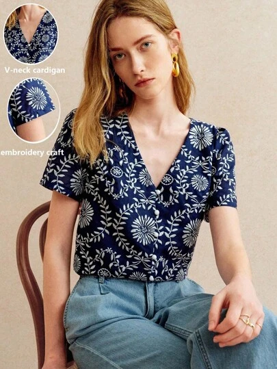 Écloséra 法式复古休闲度假藏青色纯色刺绣V领开衫短袖女士衬衫 - 藏蓝色 - 查看 1