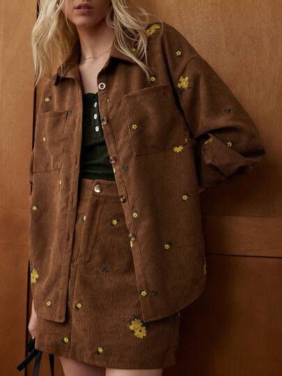 Écloséra 新款女式刺绣宽松休闲纽扣衬衫夹克,春秋季 - 咖啡棕 - 查看 2