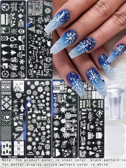 1/2/3/4/6 件套冬季圣诞美甲模板,含美甲印章、刮刀、圣诞雪花、驯鹿、圣诞树、时钟、雪人图案美甲模板、冬季美甲烫印板设计 DIY 美甲工具 - 銀色 - 查看 10