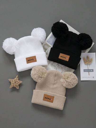 1/2/3件双绒球婴儿针织帽纯色羊毛钩针帽毛绒球儿童套头帽冬季保暖儿童无檐帽 - 彩色 - 查看 3