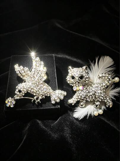 半枚蜂鸟胸针 + 猫咪胸针套装 | 闪亮水钻首饰 | 送给妈妈的完美礼物