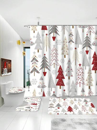 1/3/4 Pcs Christmas Tree Shower Curtain Set, Bathroom Decor Set Includes Waterproof Shower Curtain, Non-Slip Bath Mat, Toilet Seat Cover, Bath Rug And 12 Plastic Hooks, Bathroom Accessories, Home/Bar/Live Streaming Decor - 彩色 - 查看 1