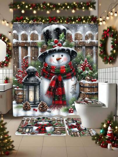 1/4 件圣诞冬季浴帘套装,雪人与松果复古棕色防水涤纶可洗窗帘,适用于圣诞节浴室装饰,带 12 个挂钩防滑浴垫和 U 型马桶盖 - 彩色 - 查看 1