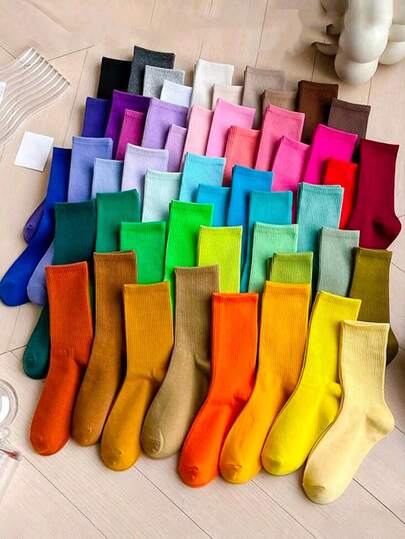 1/5/10/20 双装随机纯色休闲运动百搭时尚中筒袜,女士款,四季皆宜,返校礼物,秋季袜
