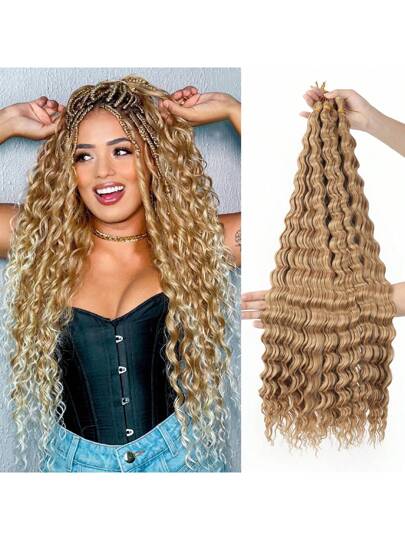 1/6套海浪針織頭髮,30英寸金色深浪卷辮髮合成卷曲針織頭髮,波西米亞針織辮髮(27#) - 金色 - 查看 1