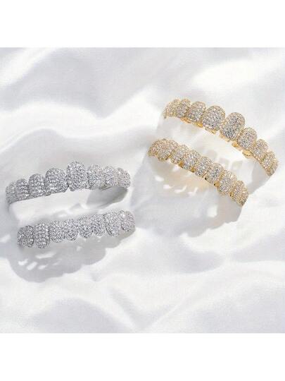 1 件嘻哈方晶锆石牙齿护齿 10 颗牙齿上下护齿 口腔朋克牙帽 角色扮演说唱歌手珠宝 - 彩色 - 查看 1