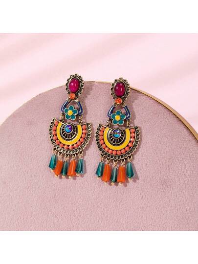 一对波西米亚复古彩色流苏珐琅几何图案串珠手工耳环,适合音乐节、海滩派对、日常佩戴,打造独特风格。纯手工制作,形状、颜色和图案位置略有差异。 - 彩色 - 查看 1