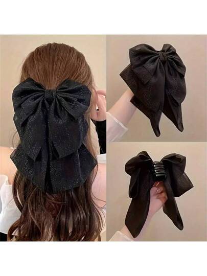 1對蝴蝶結絲帶髮飾法國風格優雅髮夾,可配高馬尾髮型。女孩的生日禮物情人節禮物 - 黑色 - 查看 1
