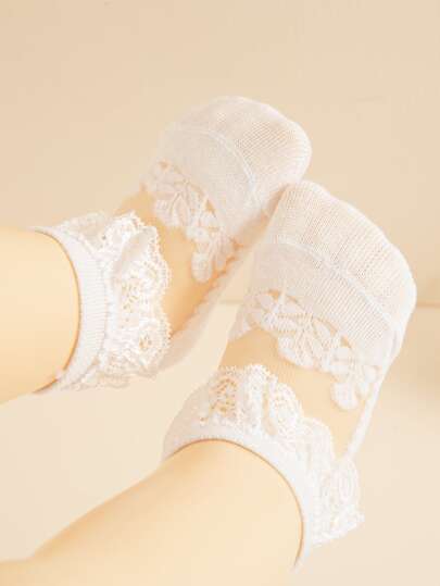 1雙兒童花邊蕾絲褶皺薄款公主襪,適用於夏季 - 白色 - 查看 1