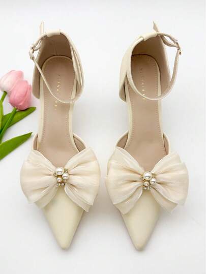 1 对女士优雅时尚鞋夹,杏色蝴蝶结珍珠水钻鞋夹,可拆卸 DIY 配件,适合休闲、派对和日常穿着 - 彩色 - 查看 1