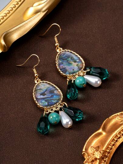 一对时尚海洋元素几何仿珍珠鲍鱼纹理薄荷绿水滴流苏耳环,独特设计 - 金黃色 - 查看 1