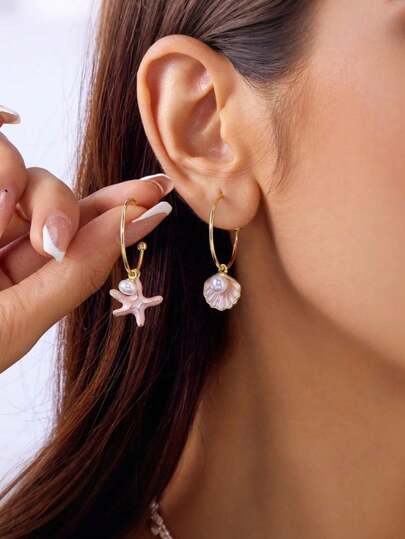 1对时尚个性化粉色沙滩度假海星贝壳仿珍珠耳环,适合日常佩戴、沙滩摄影,甜美可爱的不对称耳环