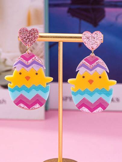 1对时尚复活节亚克力耳环,心形、裂蛋、小鸡设计,印花图案,节日礼物首饰 - 蛋 - 查看 7