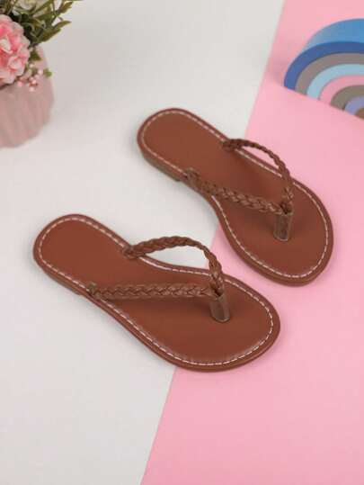 1 Pair Girl Flower Decor PU Anti-Slip Round Toe Romantic Low Heel Flat Slide Sandals, Suitable For Summer - 棕色 - 查看 6