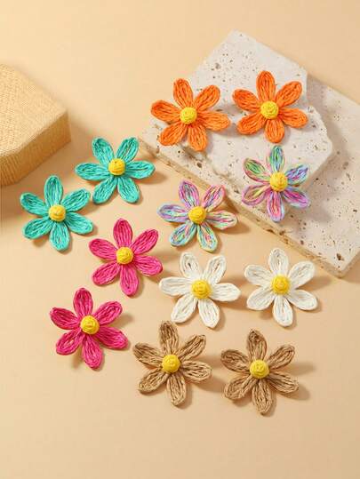 1 对手工拉菲草草编 6 瓣花耳钉,颜色对比鲜明,如米色、蓝色、绿色、粉色 - 波西米亚风格,适合日常佩戴 - 拉菲草花朵 - 查看 6