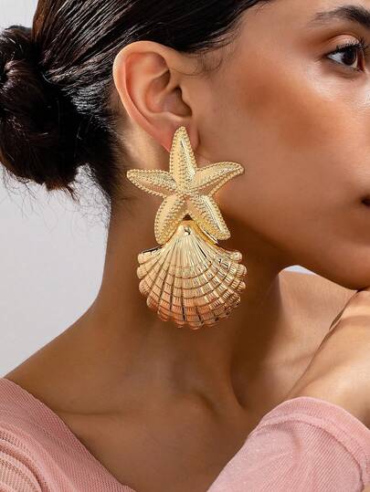 一对金属金色海星贝壳造型耳环,适合日常佩戴和度假装扮。