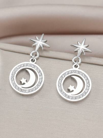 一对简约优雅的星月图案闪亮立方氧化锆不锈钢耳环,适合日常佩戴和开斋节佩戴。 - 彩色 - 查看 5