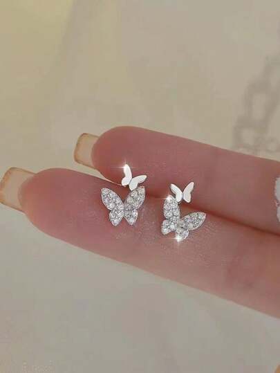 1對法式閃亮水鑽蝴蝶翼形耳環,小巧多變,適合女性日常佩戴 - 蝴蝶型 - 查看 1