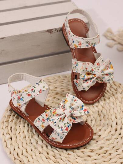 1 双加大码 2025 新款时尚百搭花卉印花女童珍珠和水钻蝴蝶结装饰可爱平底凉鞋,圆头,适合春秋季休闲、跳舞、户外穿着,闪光装饰包头公主鞋 - 米色 - 查看 6