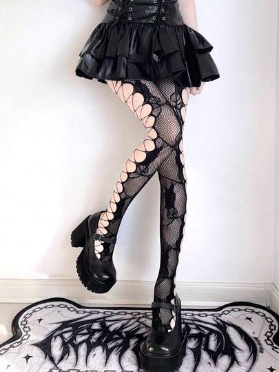 1双春夏粉色/黑色/白色镂空渔网袜,不对称网眼连裤袜,侧边玫瑰花镂空设计,做旧提花透明连裤袜,Y2K朋克摇滚节风格 - 彩色 - 查看 10