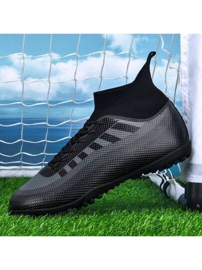 1 双镶钉足球训练鞋,高帮户外运动钉鞋,适用于人造草坪和硬地球场、室内训练场,专业大/小号橄榄色足球鞋,PU 系带防滑橡胶鞋底 TF 短钉,轻质高性能防滑设计 - 黑色 - 查看 7